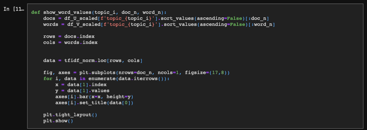 LSA는 SVD 행렬분해(특이값 분해)를 통해 추출한 대각행렬(특이값 행렬)에서 정보량이 많은(값이 큰) 부분을 추출해 최소한의 차원(벡터)으로 토픽을 구성하는 방법론이다. 따라서 SVD를 1차 수행한 후 정보량이 많은 부분행렬을 추출하는 방식으로 LSA를 구현해보도록 하자.