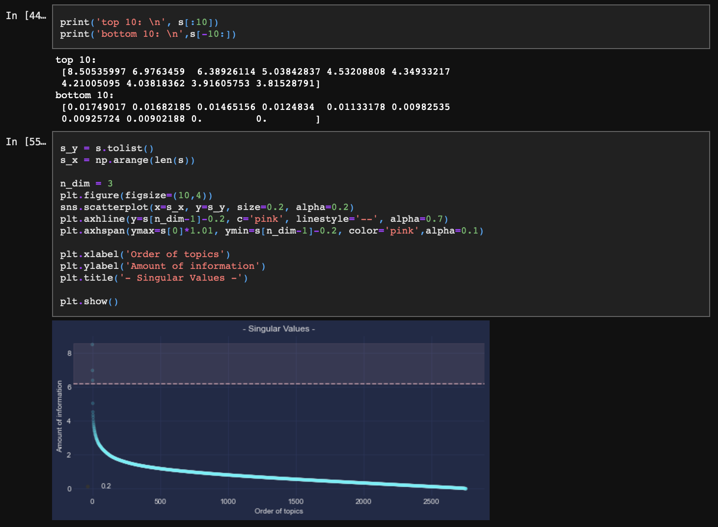 결과적으로 S는 토픽 정보를 가지고 있는데 그 크기는 (1 x 1)부터 (M x N)까지의 자유도를 가진다. 이때, 자연스럽게도 S가 (1 x 1) 일 때나 (M x N) 일 때나 모두 U*S*VT는 A의 형태는 갖춰야 하기 때문에 S가 아무리 작아도(S=(1 x 1)) 최소한의 정보는 가지고 있을 것이라 생각해 볼 수 있다. 실제로 S의 대각 원소의 값은 좌상단부터 우하단까지 내려갈수록 작아진다. 즉, S의 대각 원소 첫 번째 값이 가장 중요한 정보를 가지고 있고, 가장 마지막 값이 가장 작은 정보를 가지는 것이다. 따라서 우리는 SVD를 수행해 S를 구함으로써 A가 구성되기 위해 가장 중요한 정보부터 가장 중요하지 않은 정보까지의 값을 확인할 수 있게 되는 것이다.