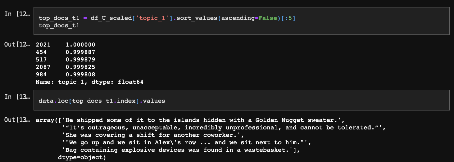 다음으로 각 토픽과 가장 일치할 확률이 높은 문서도 확인해 볼 수 있다.