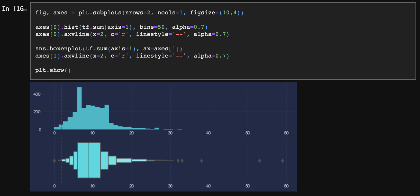 문장의 길이가 긴 것은 정보를 많이 포함하므로 문제되지 않는다. 단어 2개 이하로 구성된 너무 짧은 문장은 삭제한다.