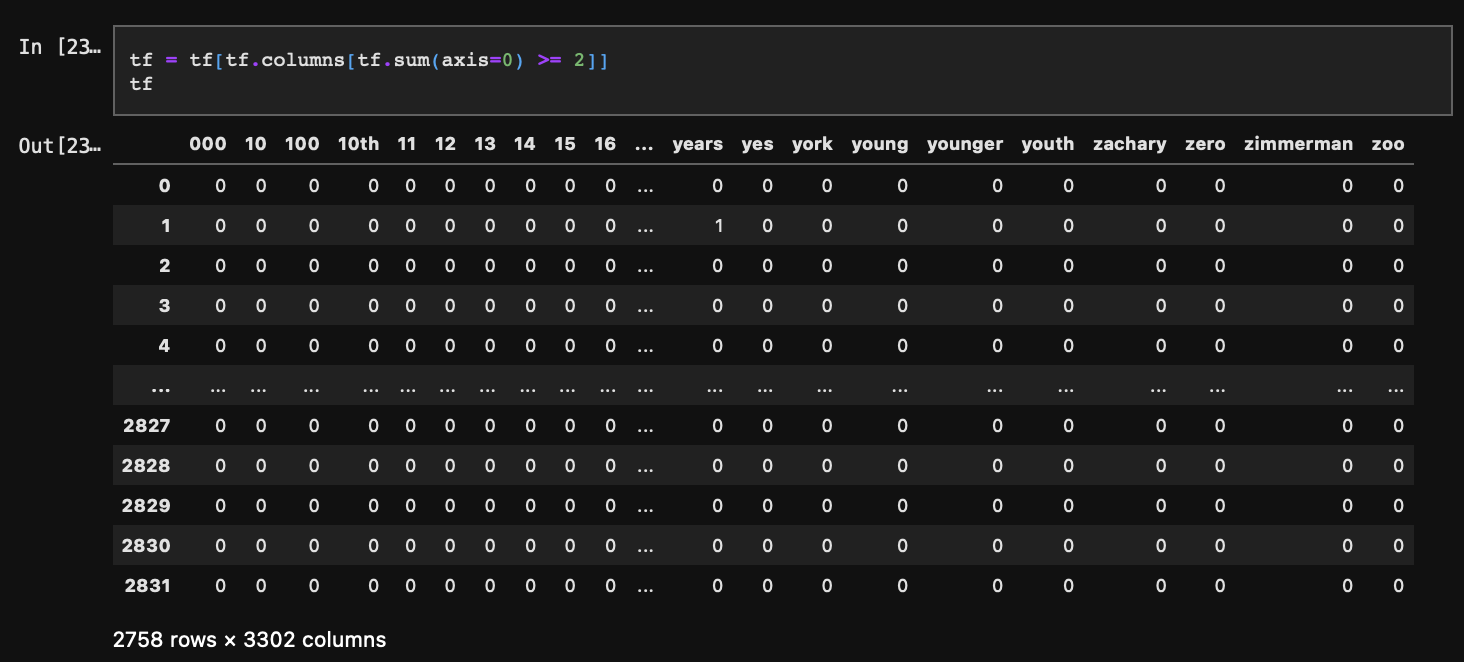 이렇게 TF-IDF 중 TF(문서별 단어 빈도) 구성을 완료했다.