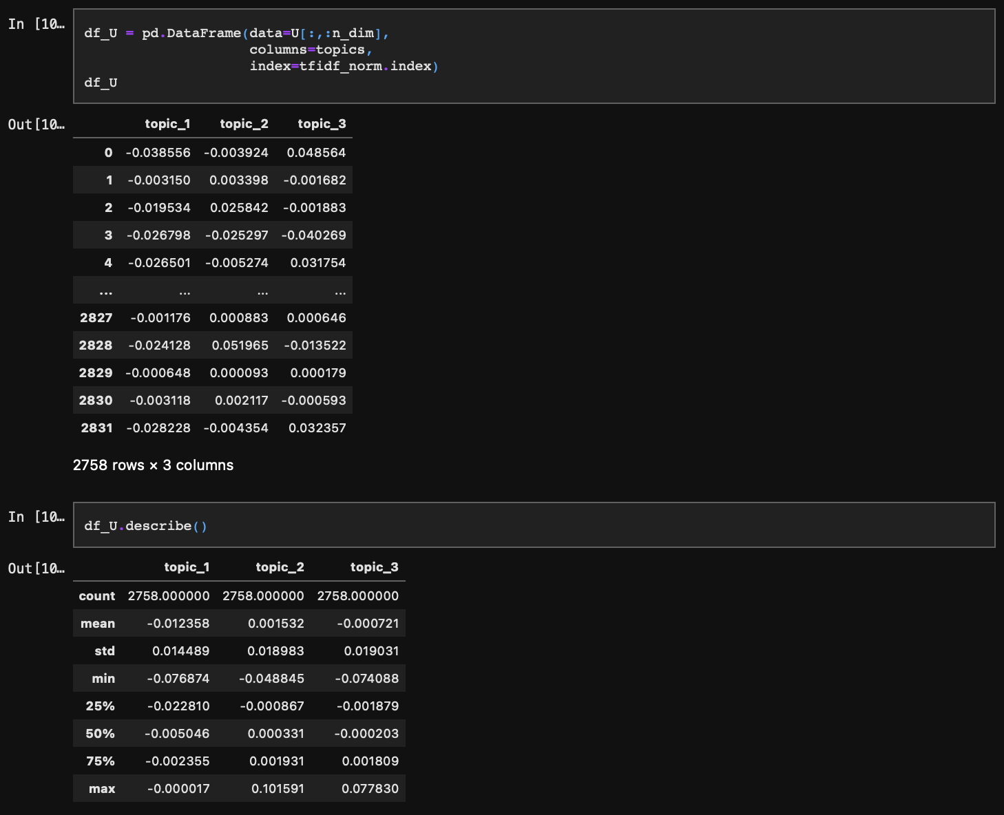 U를 데이터프레임으로 변환해줄 텐데, index를 기존 문서 인덱스에 맞게 지정해주는 것이 중요하다.