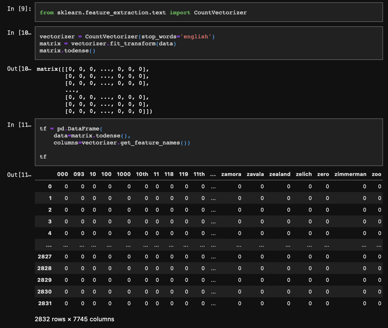 각 행(인덱스)은 문서를, 열(컬럼)은 단어를 의미한다. 각 데이터는 문서에 등장한 단어의 빈도가 되겠다.