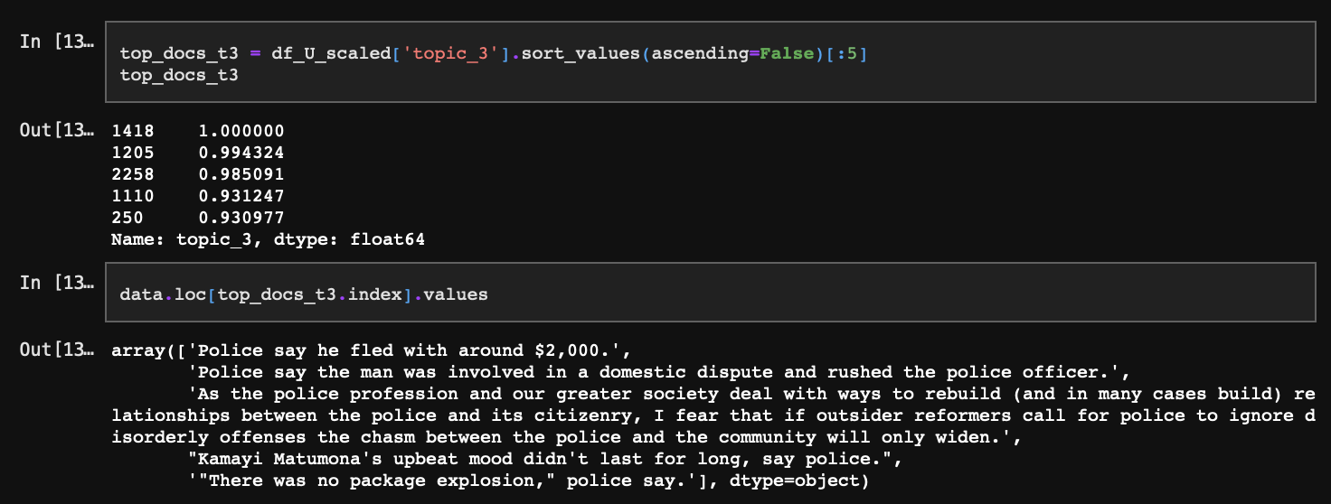U는 문서가 전체 토픽마다 일치하는 확률을 담고 있다. 특이값 s의 크기 3에 맞춰 열을 잘라주면 가장 설명력(정보량)이 높은 3개 토픽에 대한 확률만 추출된다.