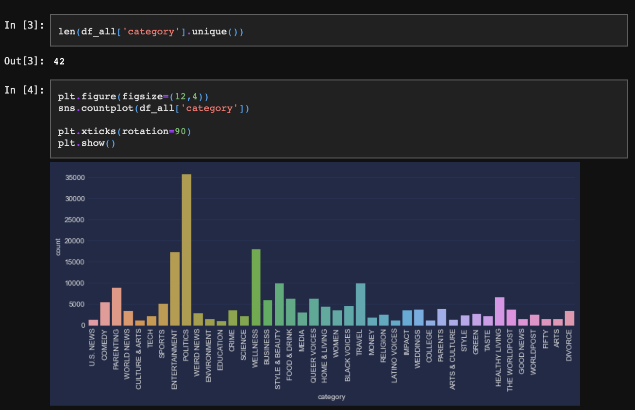 데이터(뉴스 정보)는 총 20만개, 카테고리는 42개이며 그 중 Politics가 가장 많은 데이터를 차지한다.