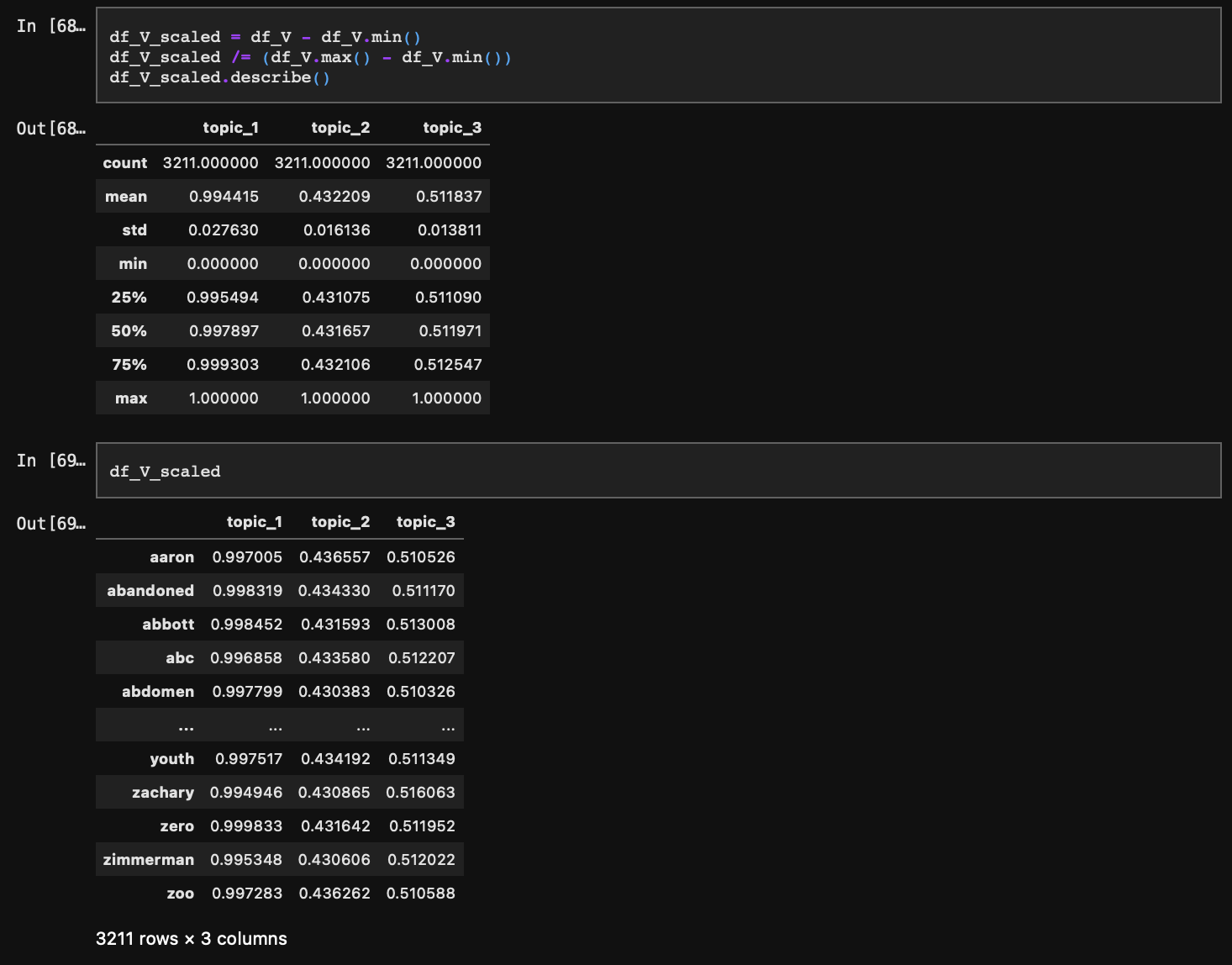 topic_1의 경우 각 단어의 확률값이 전체적으로 매우 높은 반면, topic_2와 topic_3은 0.5 근처로 낮다. 이는 추출된 특이값 중 가장 앞에 위치해 있던 topic_1의 정보량이 가장 많기 때문이다.