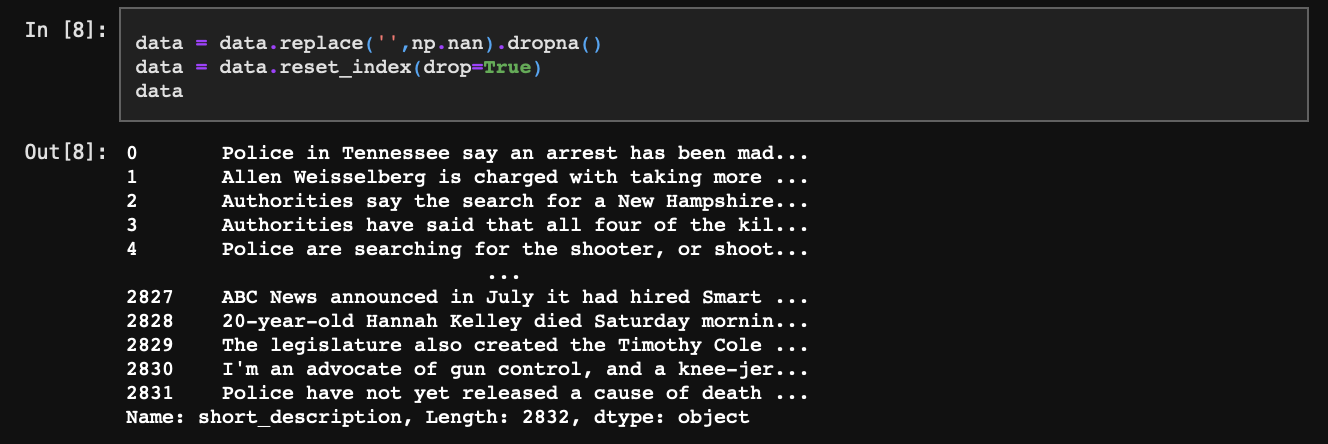 우리는 이렇게 이미 잘 나눠진 카테고리를 다시 한번 토픽모델링을 통해 세부 카테고리로 나눠볼 것이다. 분석하고자 하는 뉴스 카테고리를 하나 선정한 다음 요약 내용을 담고 있는 short_description 부분만 추출한다.