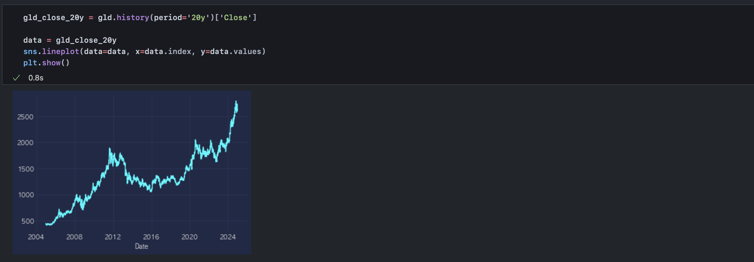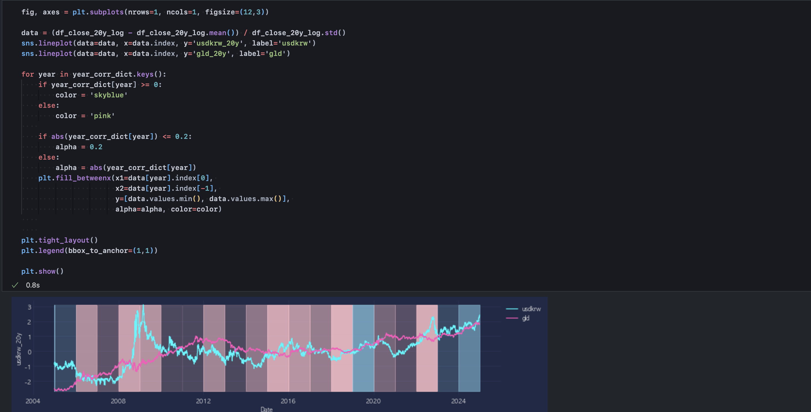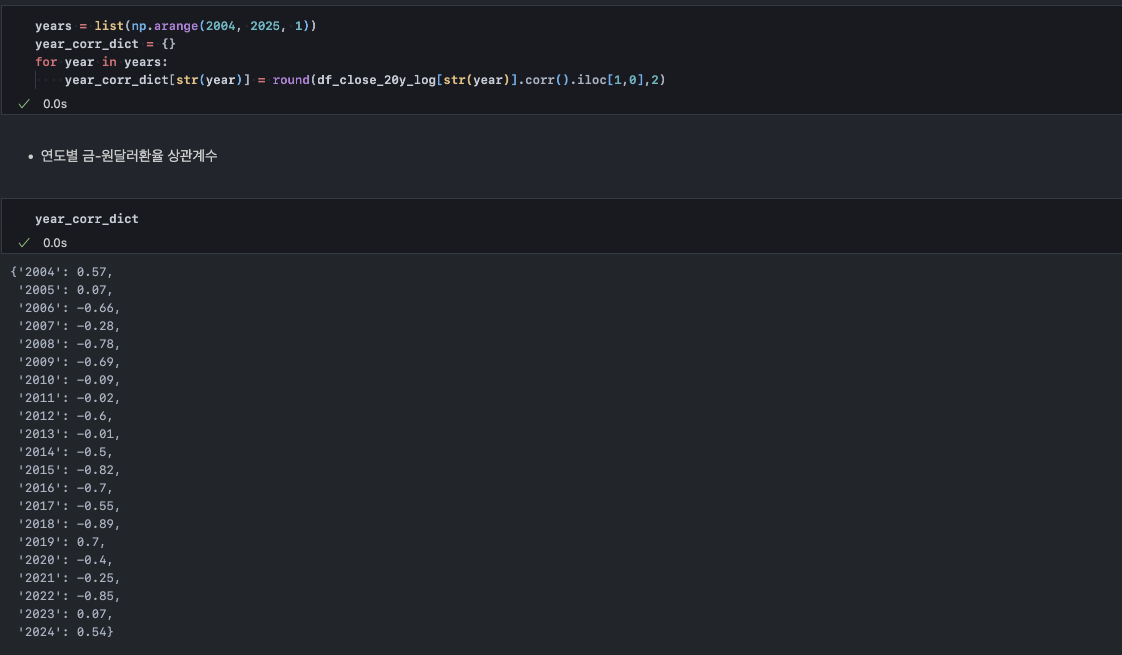 한편, 국내 정치 이슈를 논외로 하고 현재의 달러 강세가 경기 사이클의 일시적 효과인지, 혹은 구조적 변화에 따른 것인지를 금 가격과의 상관관계를 통해 확인할 수 있다. 이를 위해 20년치 금 가격 지수를 불러와 원/달러 환율과의 연도별 상관계수를 추출한다.