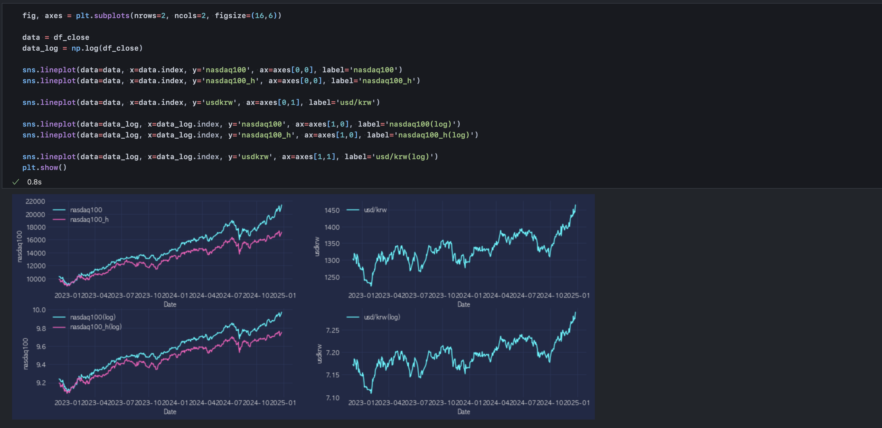 위 subplots에서 두 번째 행 2개 차트가 각각 로그 변환된 nasdaq100 H, UH 그리고 원달러 환율을 보여주고 있다.