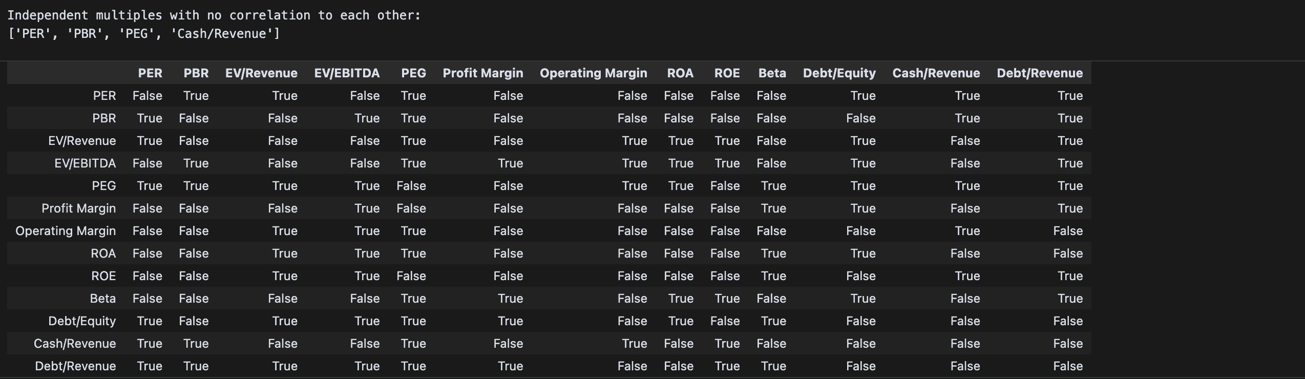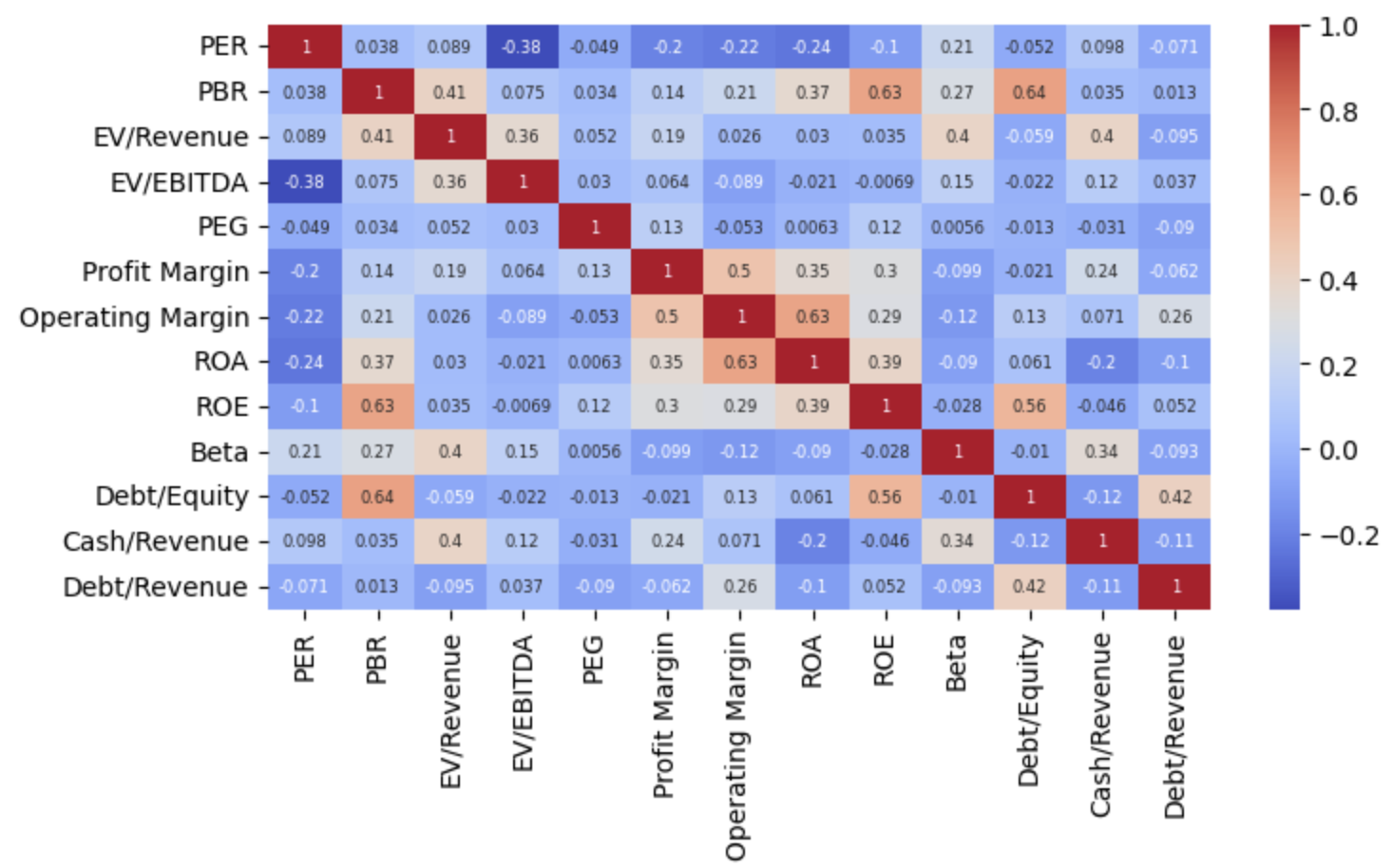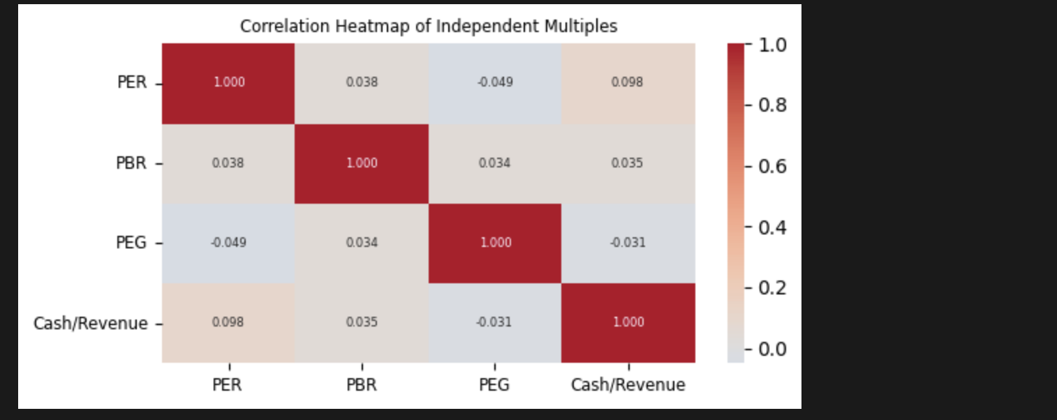 다각도의 재무 상태를 살피기 위해 많은 멀티플을 필요로 하진 않는다. 오히려 총 13개나 되는 멀티플을 모두 고려하면 자칫 비슷한 지표들, 혹은 연관 지표들의 가중치가 강하게 들어가 특정 재무 지표에 쏠린 후보군이 만들어질 수 있다.