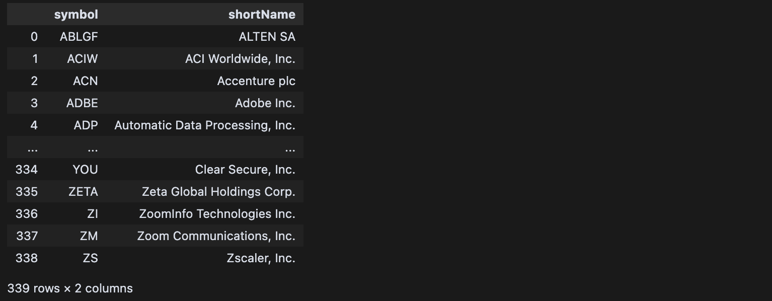 get_symbols() 함수를 기본 인자로 실행하면 아래와 같이 339개의 티커명, 기업명을 가져올 수 있다.