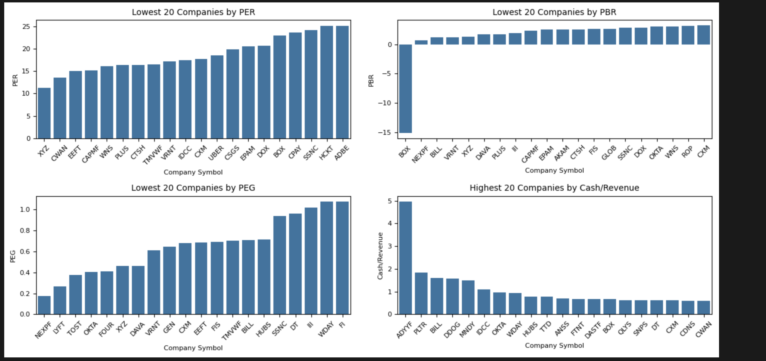 앞서 기업 선별에 활용할 멀티플을 PER, PBR, PEG, Cash/Revenue로 타겟팅했다. Cash/Revenue는 높을수록 좋고, 그 외는 분자가 가격이므로 낮을수록 좋다. 이 기준으로 각 기업들을 정렬해 보자.