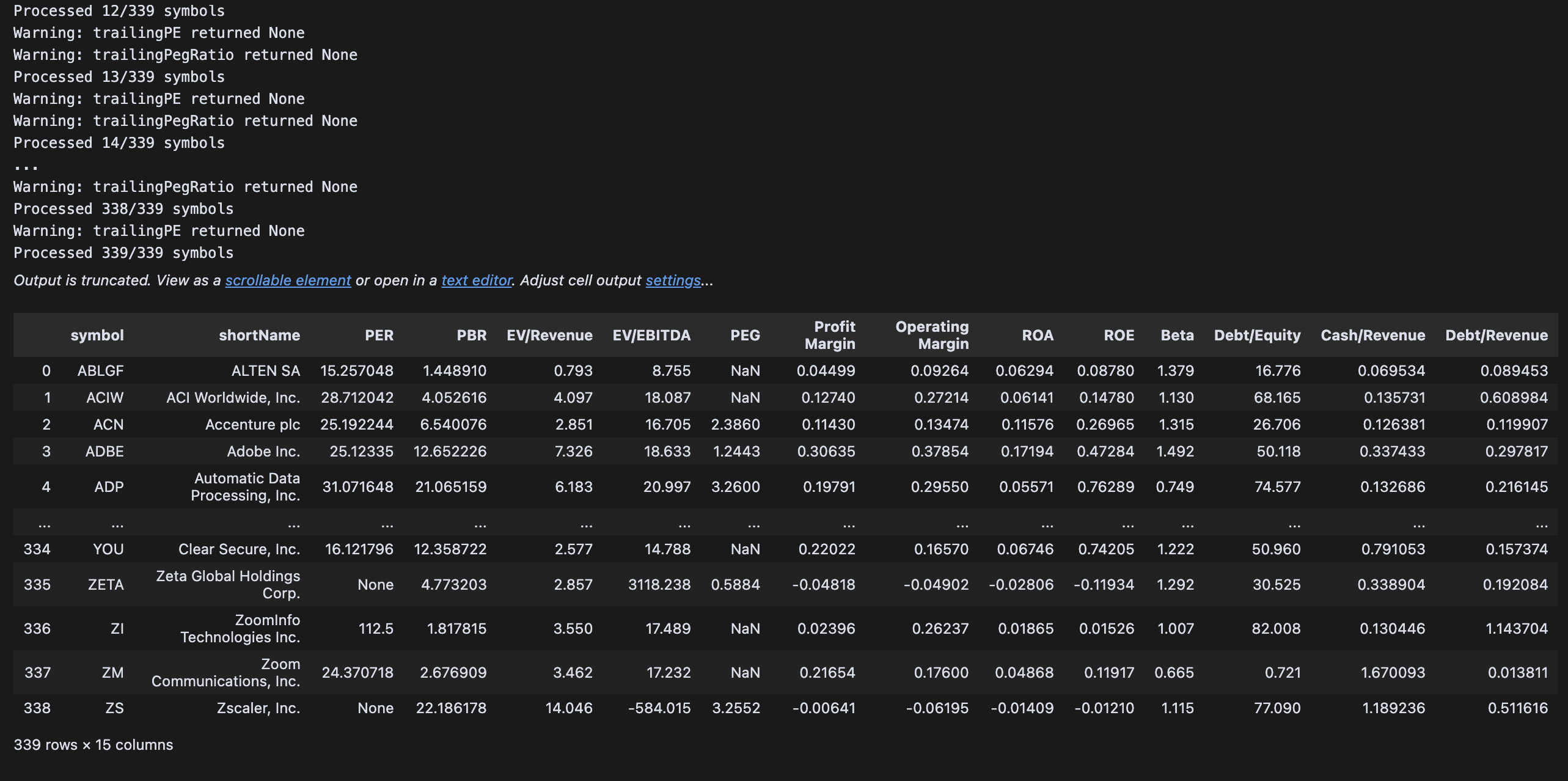 위 출력된 Warning에 작성된 것처럼 티커마다 특정 멀티플은 제공하지 않는 경우가 있는데, 간단한 수식이라 굳이 yfinance가 제공하는 데이터에 제한하지 않고 직접 계산할 수도 있다. 여기서 이 작업은 생략하고, 멀티플 중 하나라도 누락된 값이 있으면 해당 티커는 제외하겠다.