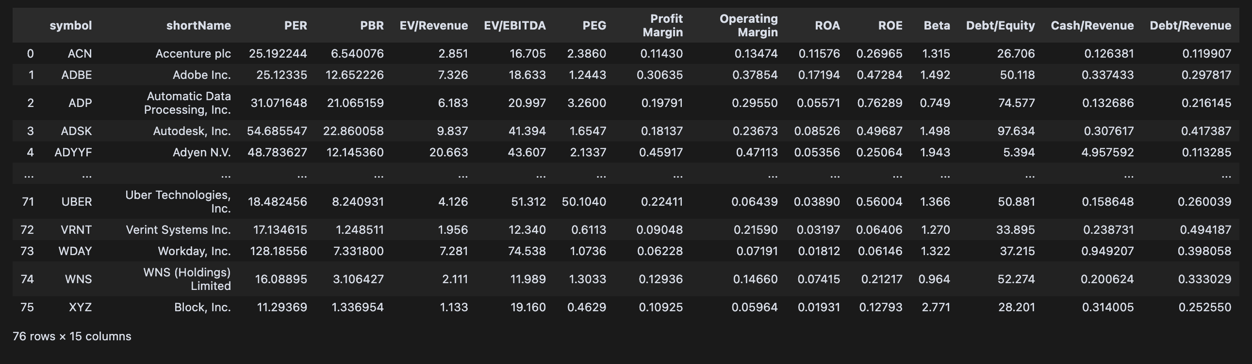 어떤 기준으로 후보군을 추려낼 것인지 명확하지 않을 때는 대표적인 재무 멀티플을 사용해 볼 수 있다. 야후 파이낸스 파이썬 패키지는 이미 계산된 멀티플을 제공하고 있으니 이를 활용해 미국 상장 소프트웨어 기술 기업 중 재무 상태가 양호한 후보군을 추려내는 작업을 진행해 보자.