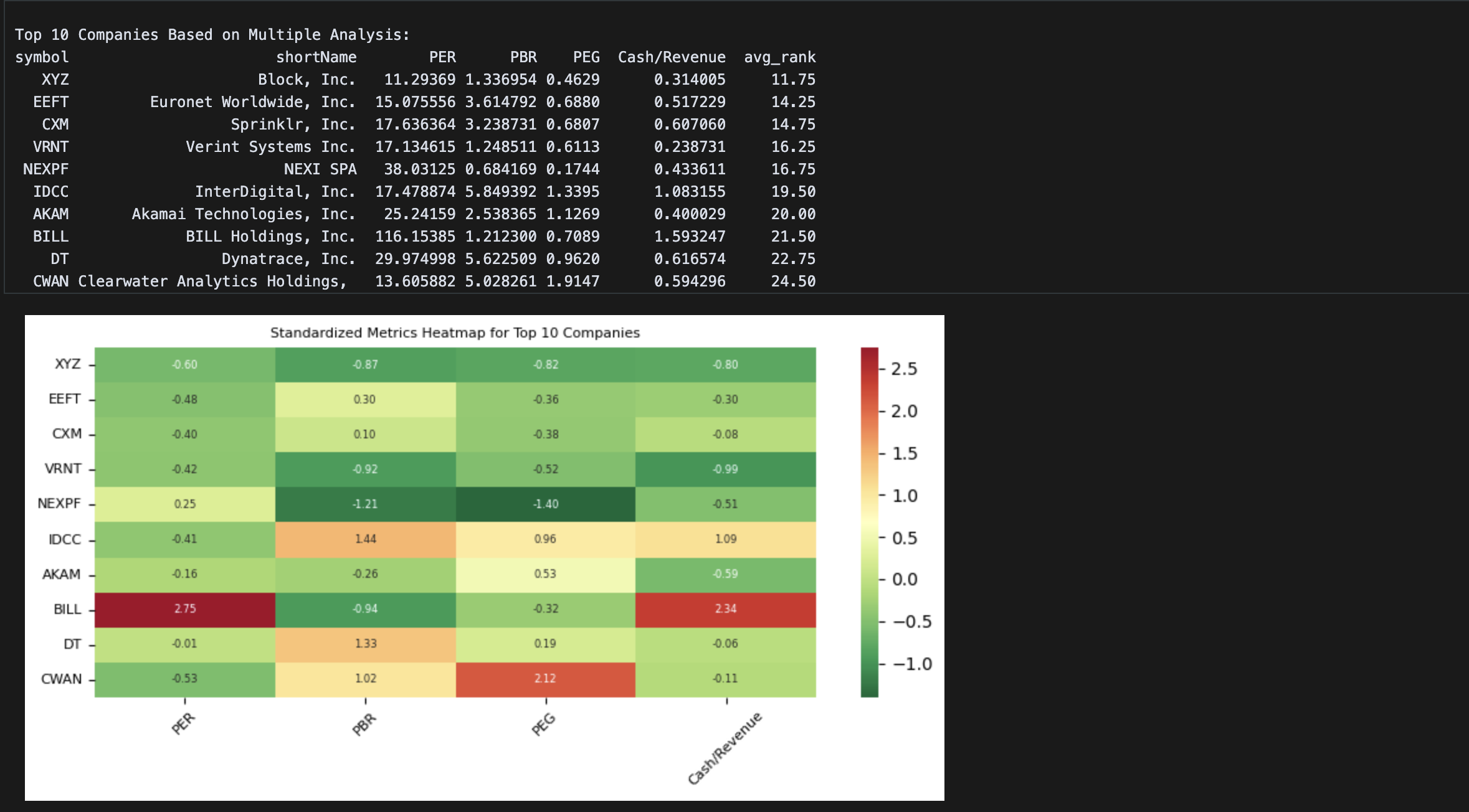 종합 순위로 정렬하고, 각 값을 지표별 0을 중심으로 표준화하여 히트맵으로 표현했다. 잭 도시가 창업한 미국 모바일 결제 기업 XYZ를 포함한 상위 두 개의 기업이 전자 결제 서비스, 다음은 고객관리 서비스 두 기업이 뒤를 잇는다.