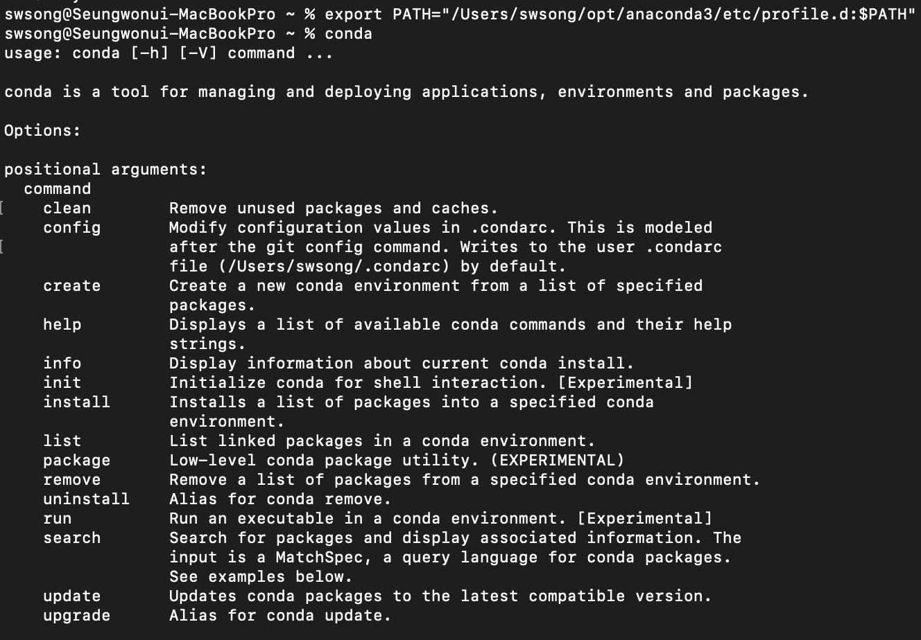 ~~ anaconda3/etc/profile.d 경로 하위에 conda.sh 가 있기 때문에 아래와 같이 export 해준다.