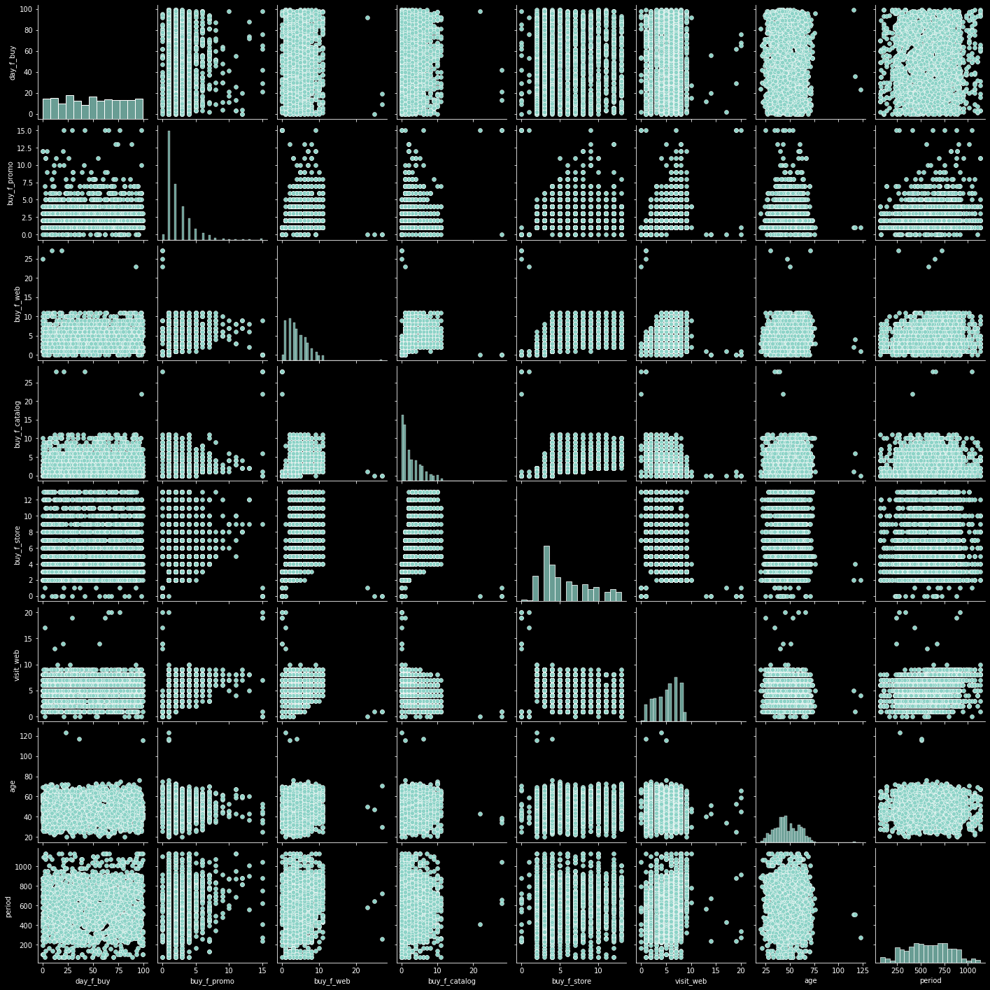 pairs_df = customer_df.loc[:, [col for col in customer_df.columns if col not in ['id','promo1','promo2','promo3','promo4','promo5','promo6','complain']]]